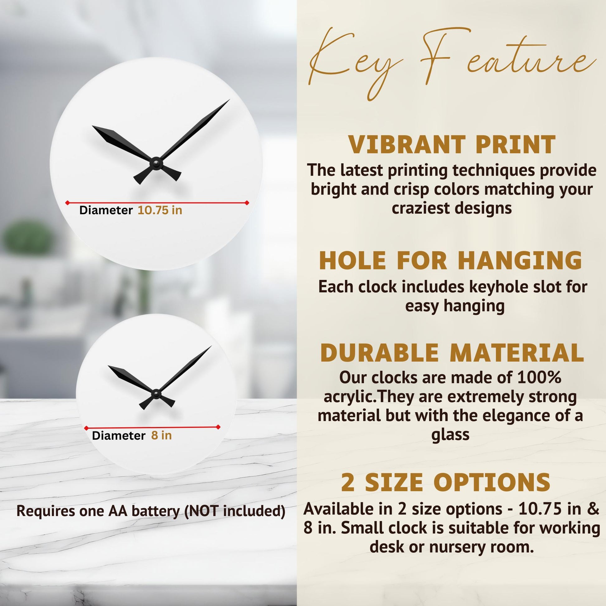 • Available in two size options (10.75''×10.75'' and 8''×8''). The small size clock is ideal for working desk, nursery room or office room.