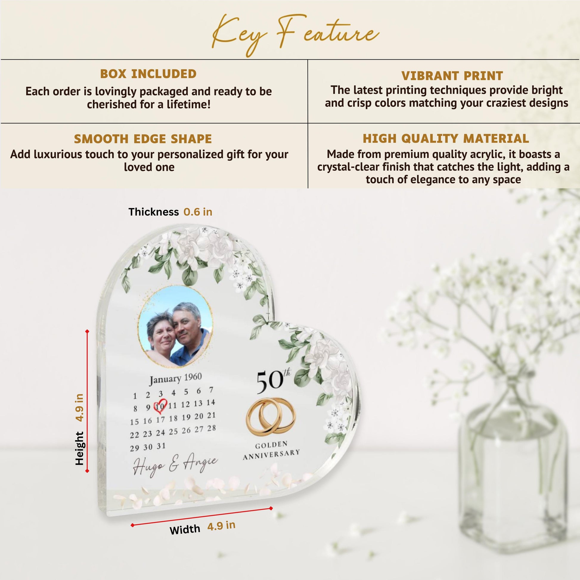 Looking for a one of a kind first anniversary gift? Look no further! Celebrate the lasting love and happiness of marriage with our stunning personalized 50th wedding anniversary heart plaque. Crafted with precision and care, this stunning piece of art is a perfect expression of your heartfelt emotions. Made from premium quality acrylic, it boasts a crystal-clear finish that catches the light, adding a touch of elegance to any space. The vibrant printed design creates a unique gift giving experience that will leave your special someone speechless! This is the ideal present for your beloved partner, family members, or dear friends on special occasions like anniversaries, weddings, birthdays, or Valentine's Day. Let your loved ones know how much they mean to you.Show your loved ones how much you care with our Printed Heart Shaped Acrylic Plaque!